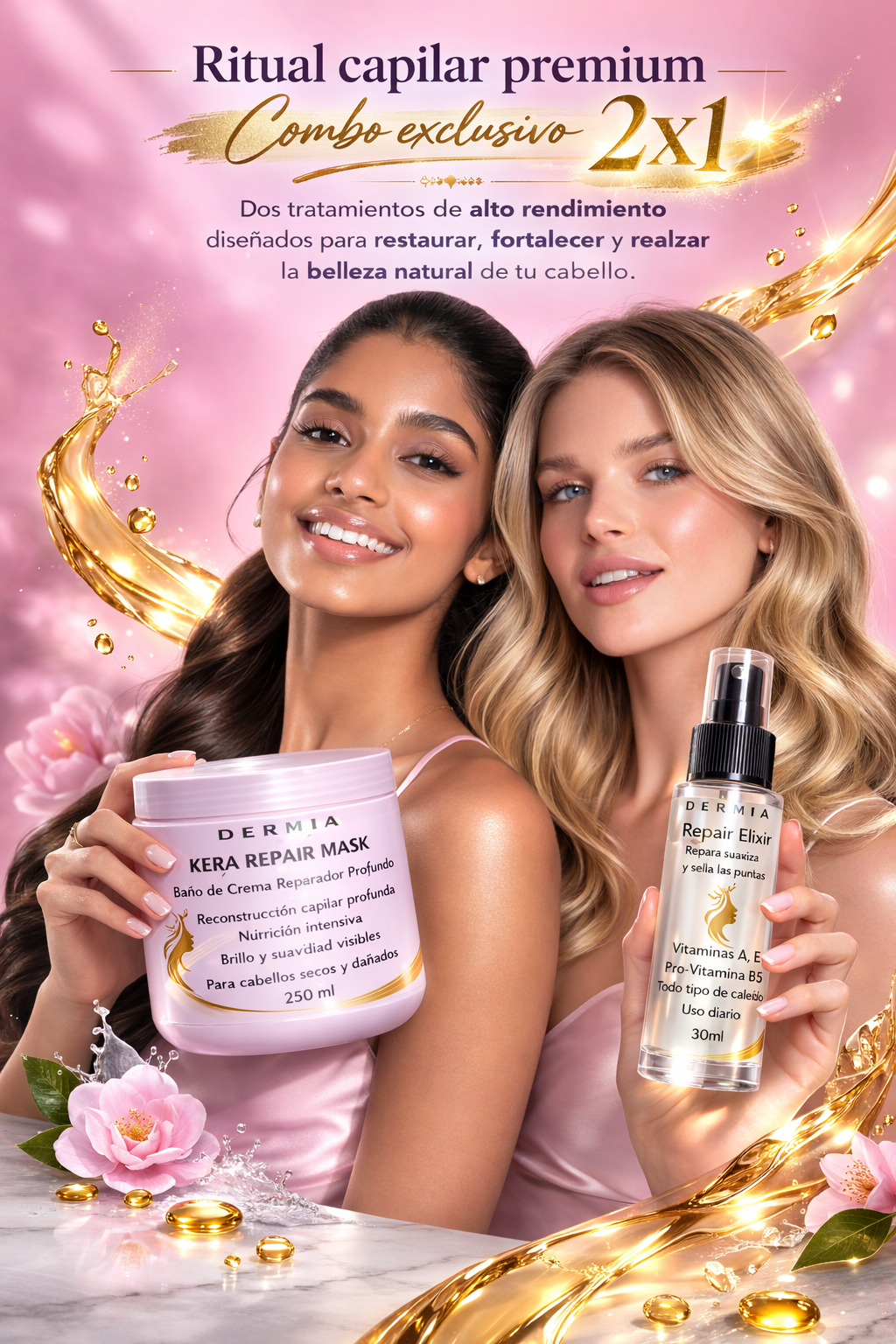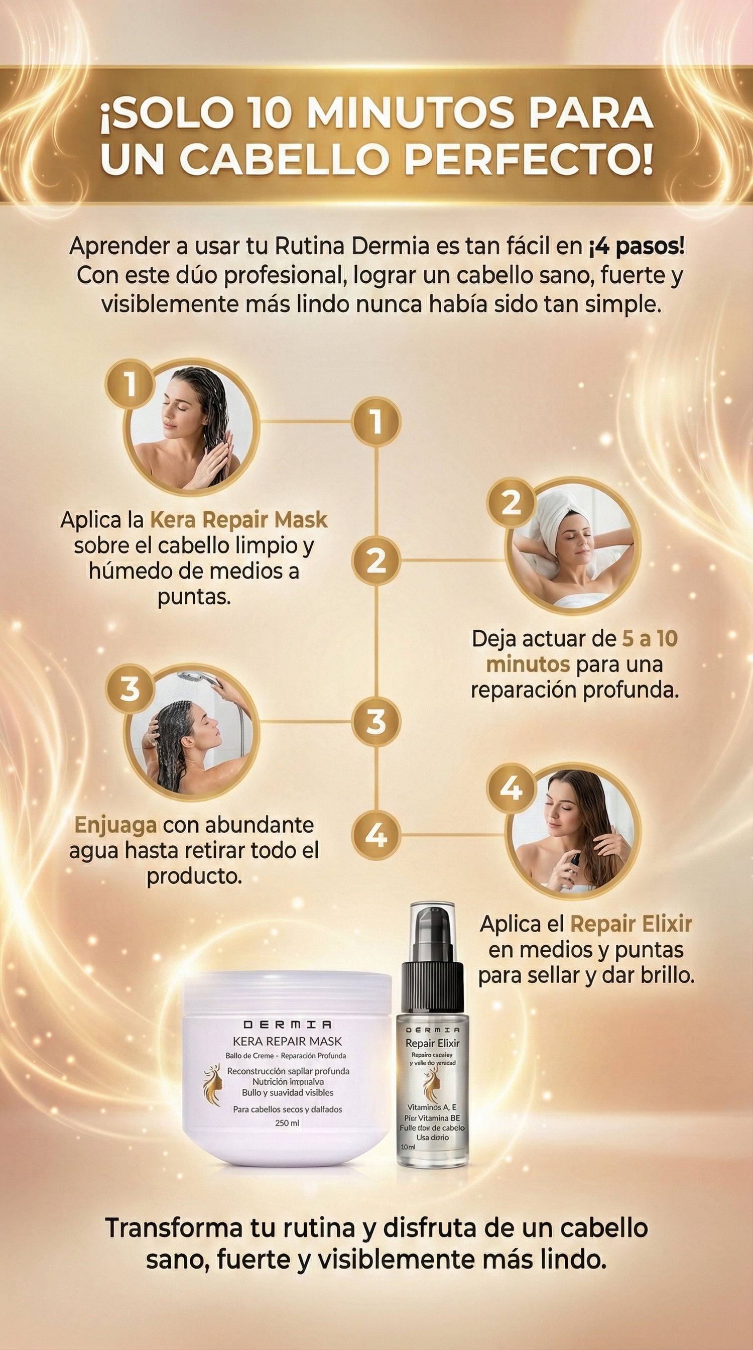 En solo 10 minutos, la rutina Dermia repara, nutre y sella la fibra capilar, dejando el cabello más fuerte, suave y visiblemente brillante desde la primera aplicación.