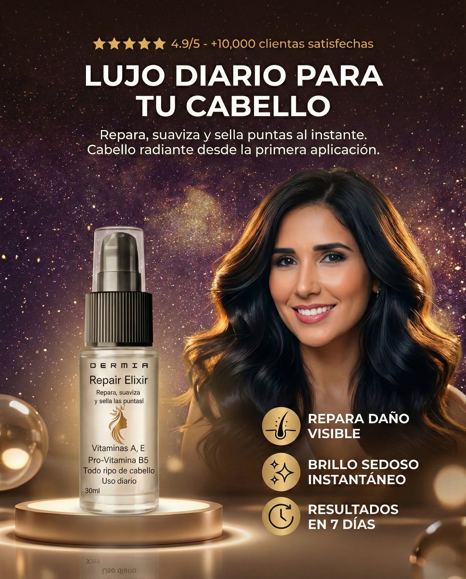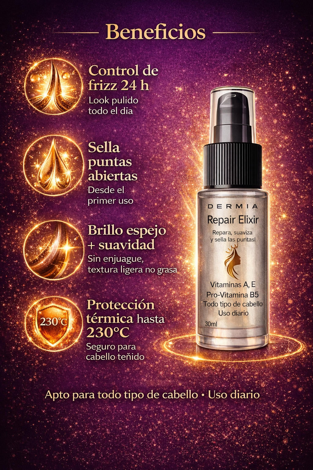 Transforma tu cabello con el Repair Elixir de DERMIA. Este tratamiento reparador sin enjuague cuenta con una textura ligera y no grasa, perfecta para el uso diario en todo tipo de cabello, incluyendo el cabello teñido.